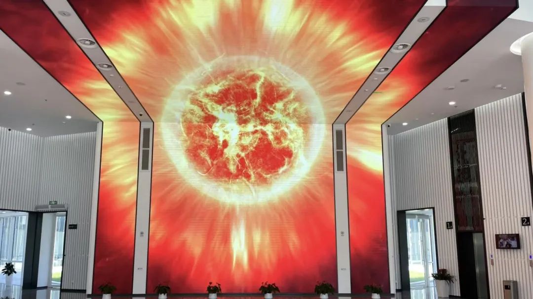 聚变创新展览馆入口显示屏上演示着核聚变反应过程。明亮的中心向四周辐射出强烈红色和黄色光芒,酷似太阳。在中国,这项“逐日”工作,已经持续了半个多世纪。李靖茹 摄